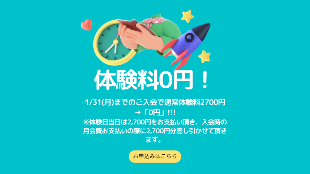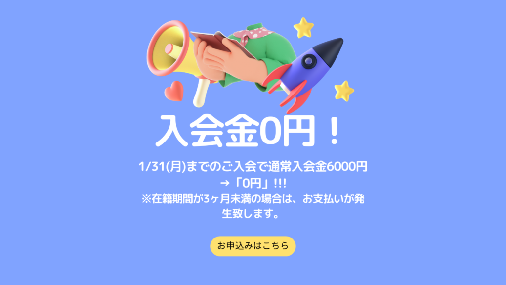 期限までのご入会で、入会金・体験料が「0円」になる